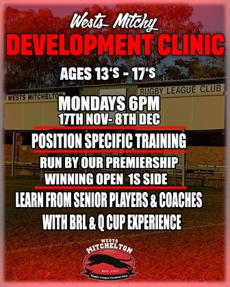 🏉 Wests Mitchy Development Clinic (13s–17s) 🏆 Sharpen your skills this off-season with position-specific training led by our premiership-winning Open 1’s squad 💪 Learn from players and coaches with A Grade & Q Cup experience and take your game to the next level! 📅 Mondays | 17th Nov – 8th Dec ⏰ 6:00pm 📍 Wests Mitchelton RLFC